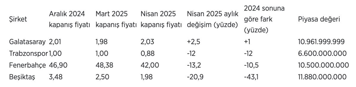Borsa’da süreç gören 4 spor şirketinin Aralık 2024, Mart 2025 kapanış fiyatı, Nisan 2025 değişimi, 2024 sonuna nazaran farkı ve piyasa pahası şöyle: