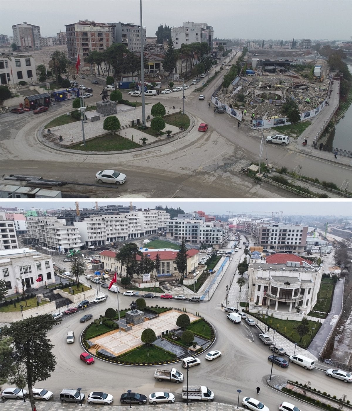 Ortaya çıkan kareler, 2023’te enkaz haline gelen alanların yerinde yükselen yeni yapıları ve kent genelinde yürütülen kapsamlı inşa çalışmalarını ortaya koydu.