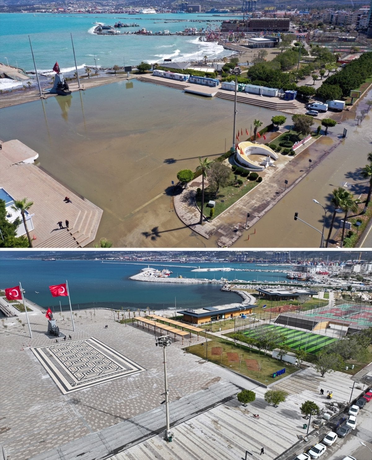 Depremlerle yaklaşık 80 santimetre çökmenin meydana geldiği İskenderun kıyı bandı da yenilenen haliyle görüntülendi. Üç yıl ortayla kaydedilen imajlar, Etraf, Şehircilik ve İklim Değişikliği Bakanlığı tarafından düzenlenen sahil bandının toplumsal donatılarla yine canlandırıldığını gösterdi.