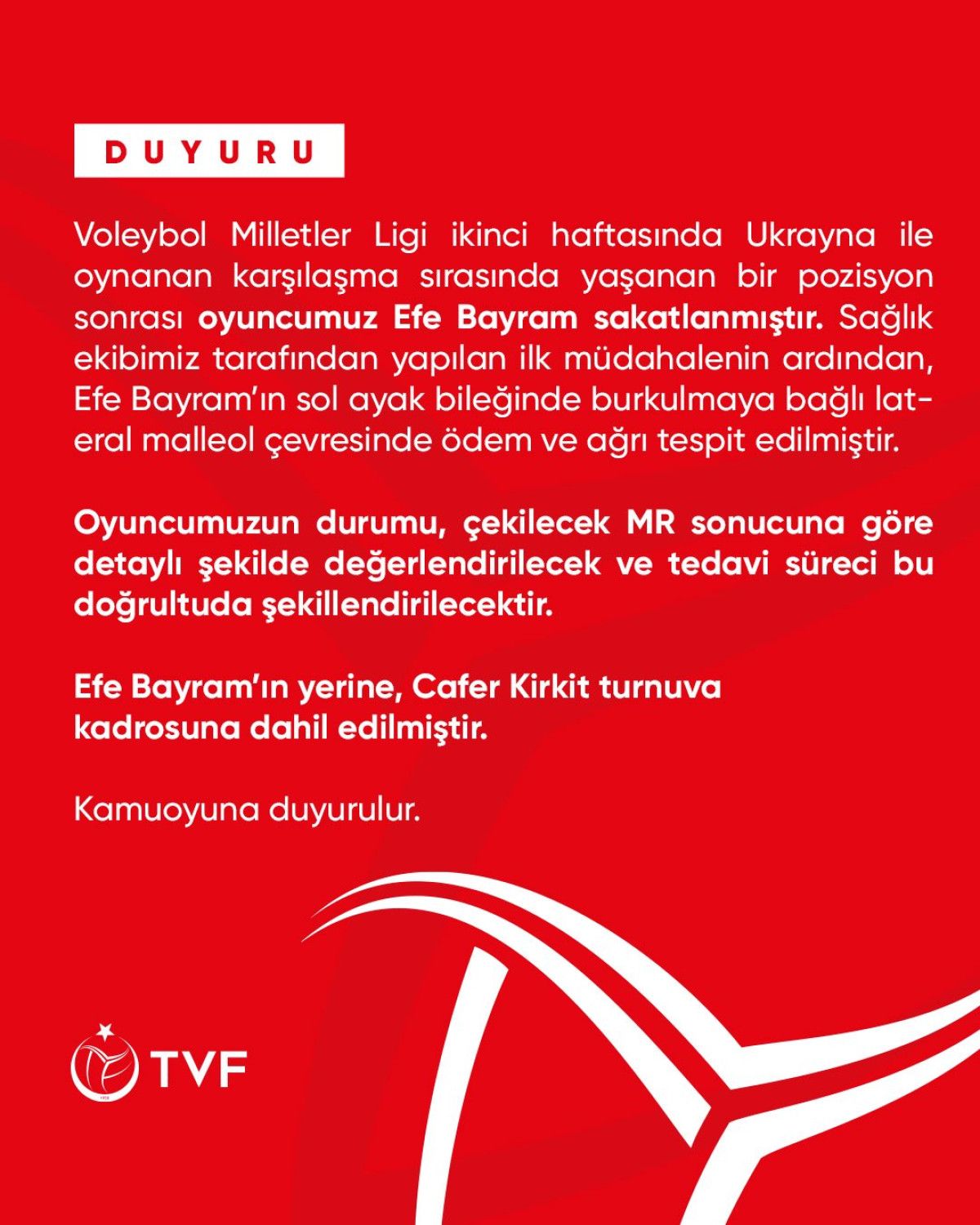 Voleybol Milletler Ligi ikinci haftasında Ukrayna ile oynanan müsabaka sırasında yaşanan bir konum sonrası oyuncumuz Efe Bayram sakatlanmıştır. Sıhhat grubumuz tarafından yapılan birinci müdahalenin akabinde, Efe Bayram’ın sol ayak bileğinde burkulmaya bağlı lateral malleol etrafında ödem ve ağrı tespit edilmiştir. Oyuncumuzun durumu, çekilecek MR sonucuna nazaran ayrıntılı biçimde pahalandırılacak ve tedavi süreci bu doğrultuda şekillendirilecektir. Efe Bayram’ın yerine, Cafer Kirkit turnuva takımına dahil edilmiştir.