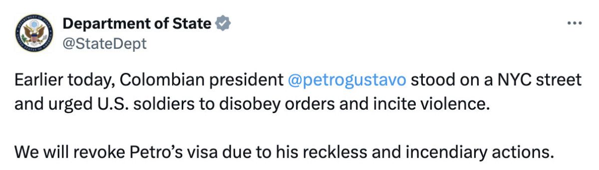 ABD Dışişleri Bakanlığı bu kapsamda, Kolombiya Cumhurbaşkanı Gustavo Petro’nun vizesinin iptal edileceğini duyurdu.