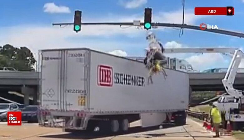ABD’nin Louisiana eyaletinde seyreden bir tır, sepetli vinç üzerinde trafik ışığı bakımı yapan elektrik çalışanına çarptı. Talih yapıtı can kaybı yaşanmayan kaza, anbean araç kamerasına yansıdı.