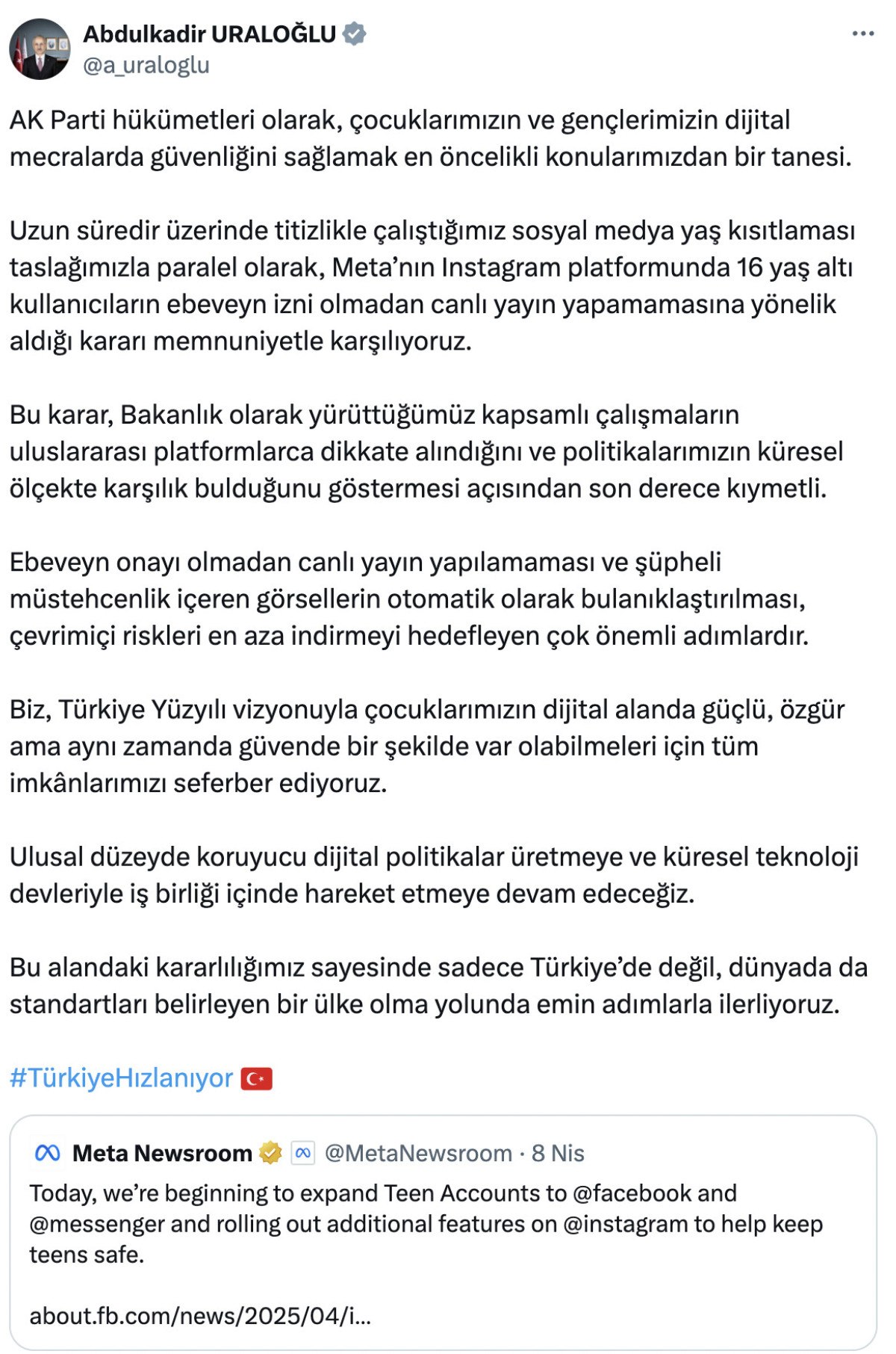 Ulaştırma ve Altyapı Bakanı Abdulkadir Uraloğlu, sosyal medya hesabından yaptığı paylaşımda, Meta’nın toplumsal medya hesabından 16 yaş altı çocuklara ait duyurduğu kararı alıntıladı.