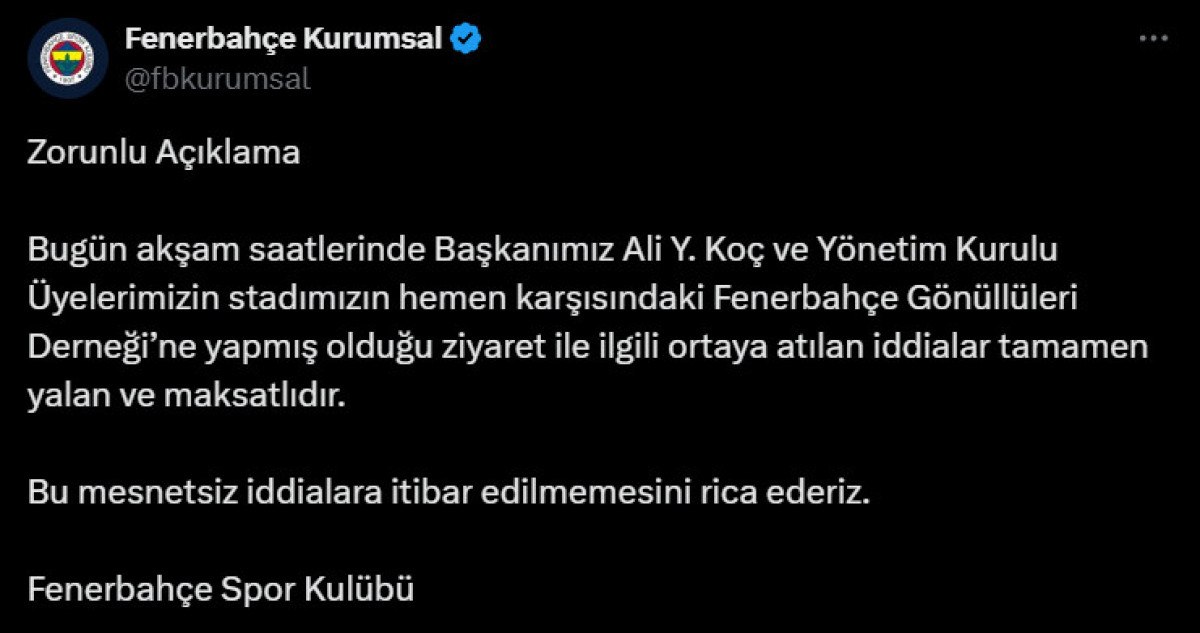 Bugün akşam saatlerinde Liderimiz Ali Y. Koç ve Yönetim Kurulu Üyelerimizin stadımızın çabucak karşısındaki Fenerbahçe Gönüllüleri Derneği’ne yapmış olduğu ziyaret ile ilgili ortaya atılan tezler büsbütün palavra ve niyetlidir. Bu mesnetsiz argümanlara prestij edilmemesini rica ederiz.