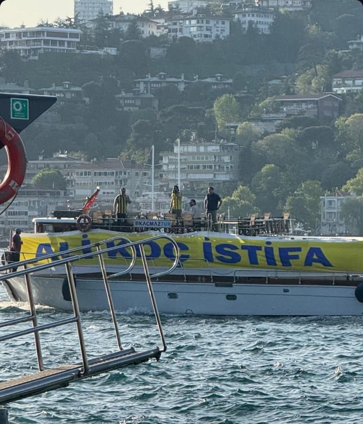 Tekneyle yalının önünden geçen Fenerbahçe taraftarları, üzerinde “Ali Koç istifa” yazılı pankart açarak tezahüratlarda bulundu.