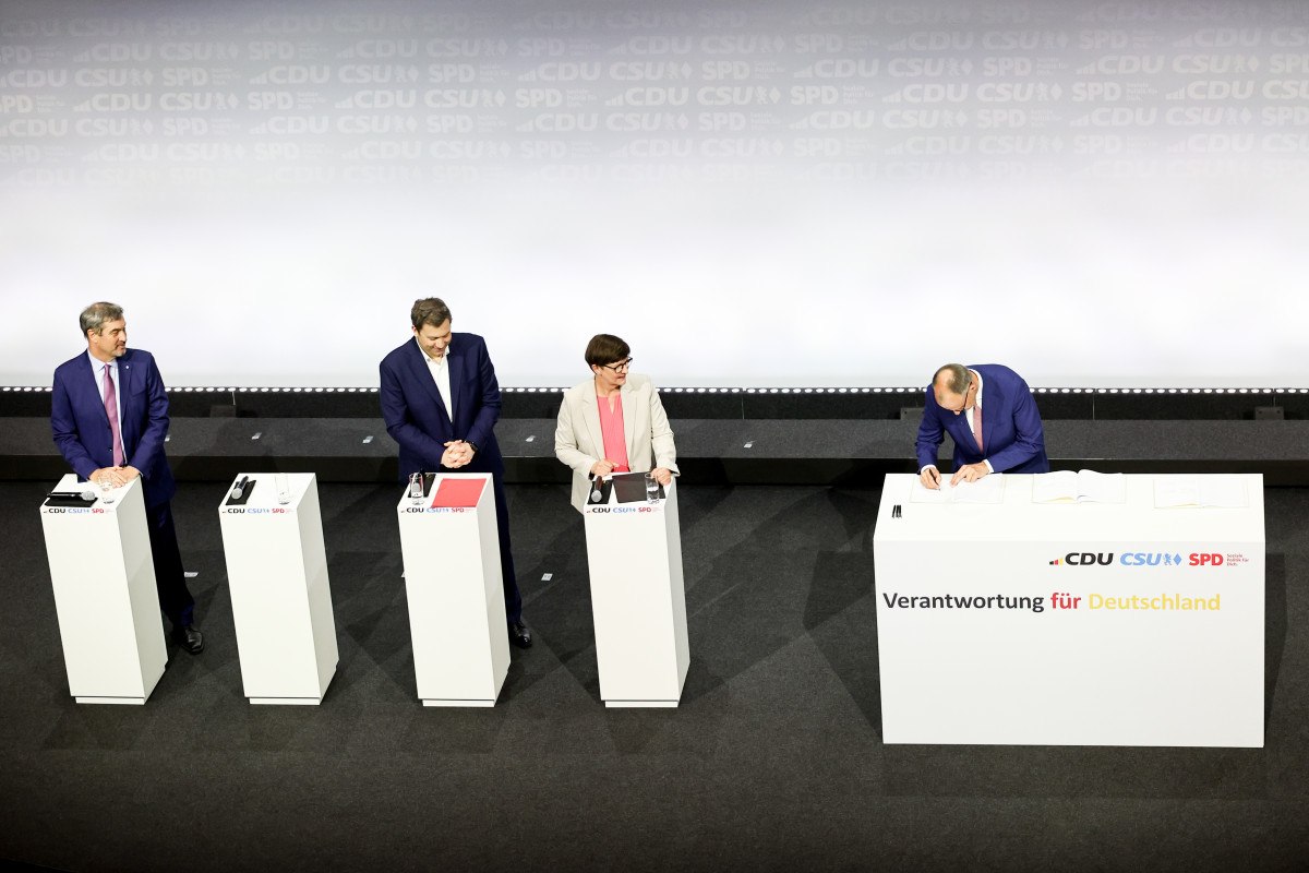 Törende; Koalisyon hükümetinde Başbakanlığı üstlenecek Hristiyan Demokrat Birlik (CDU) Partisi Genel Lideri Friedrich Merz, Hristiyan Sosyal Birlik (CSU) Partisi Genel Lideri Markus Söder ve SPD’nin eş liderleri Lars Klingbeil ile Saskia Esken, “Almanya için sorumluluk” başlığını taşıyan 144 sayfalık koalisyon kontratına imza attı.