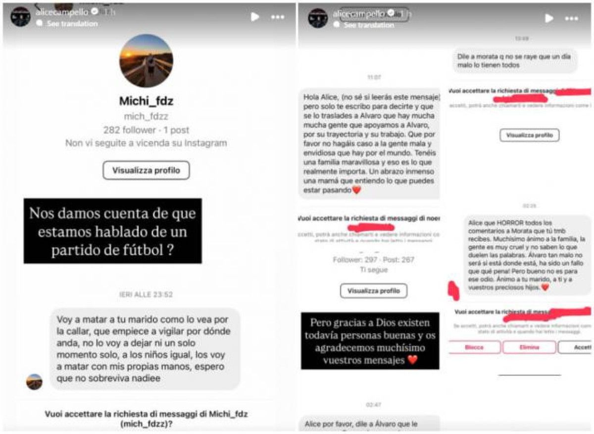 Alvaro Morata’nın eşi Alice Campello, mevt tehdidi aldıklarını açıkladı.