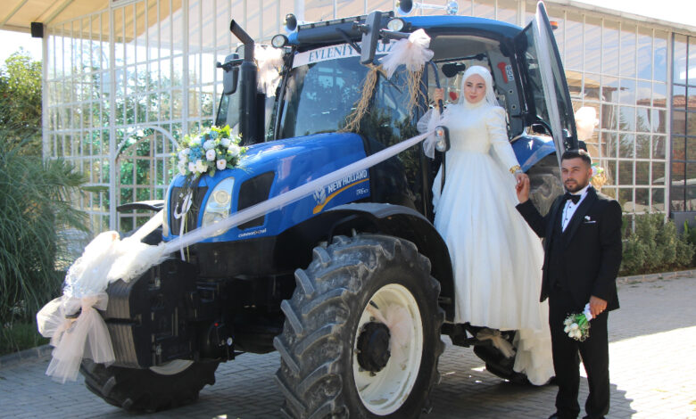 Çiftçi Büşra Yaman ile kepçe operatörü Emrullah Satılmış lisanlara destan düğünleri öncesi düğün arabası olarak traktörlerini kullanmaya karar verdi.