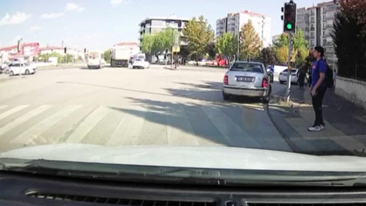 Başka bir arabanın araç içi kamerasına yansıyan imgelerde kazanın meydana geldiği anda yaya geçidinde bekleyen öğrencinin hızlı bir halde üzerine gelen arabası fark ettiği, arabadan son anda kaçarak talih yapıtı yara almadan kurtulduğu görüldü.
