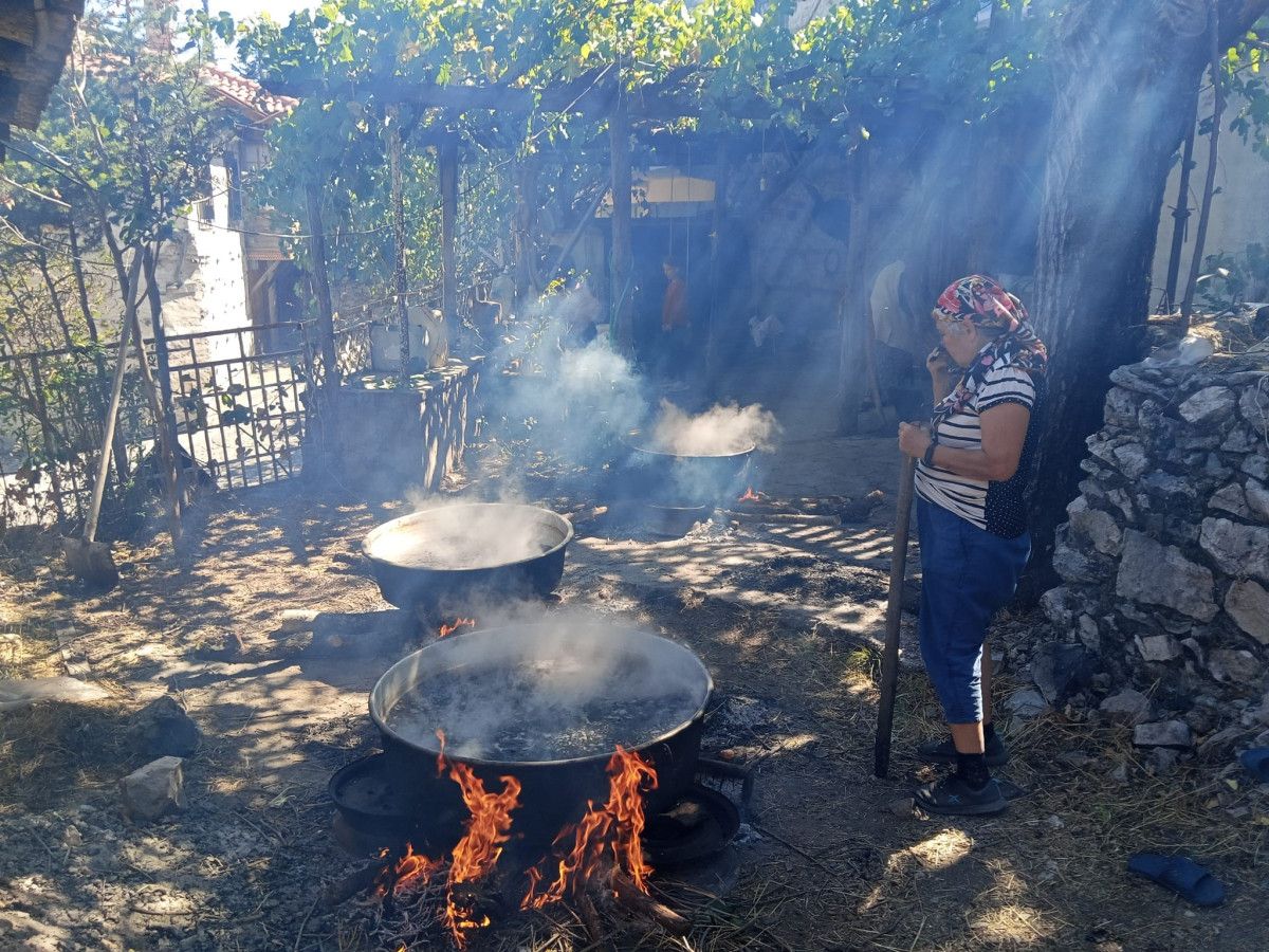 Doğal üretimin göstergesi olarak arıların bile pekmeze ilgi gösterdiğini söyleyen Gümüş, “Doğal olduğu için arılar geliyor. Doğal olmasa zati gelmezler. Üzümümüzü sıktık, külü koyduk, pekmezimizi yaptık. Afiyetle yiyeceğiz” dedi.