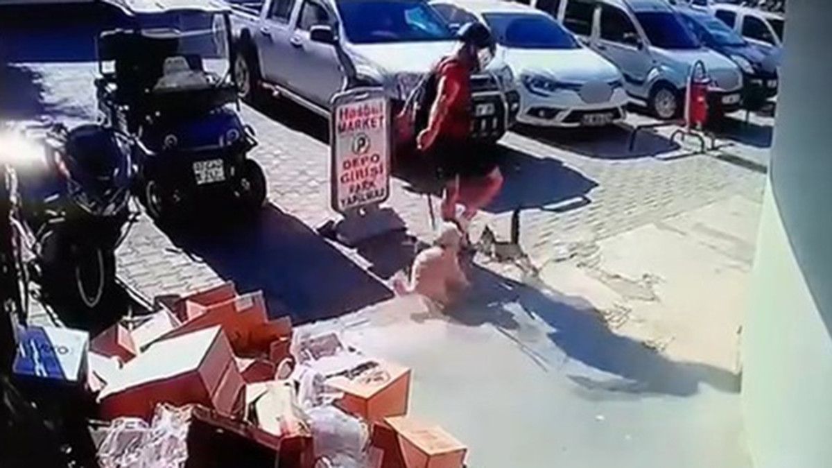 Görüntülerde kedinin köpeğe gerçek atak yaptığını gören şüphelinin hayvana tekraren tekme attığı görülüyor.