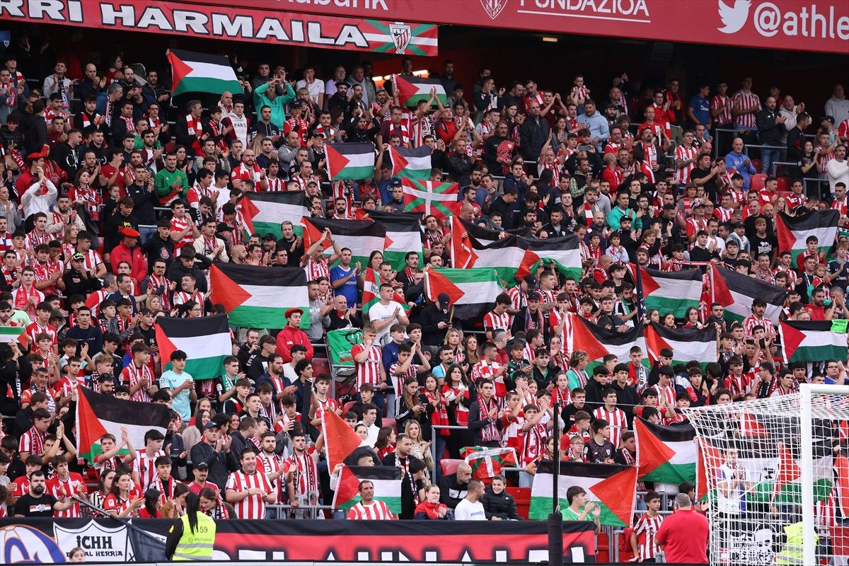 Athletic Bilbao taraftarları, maç öncesi tribünlerde Filistin bayrağı açtı.
