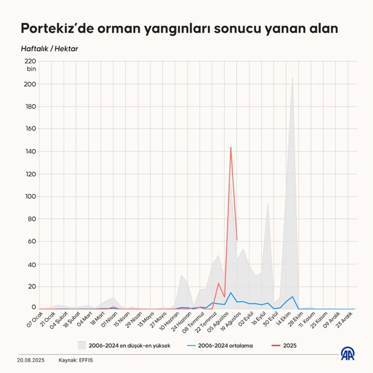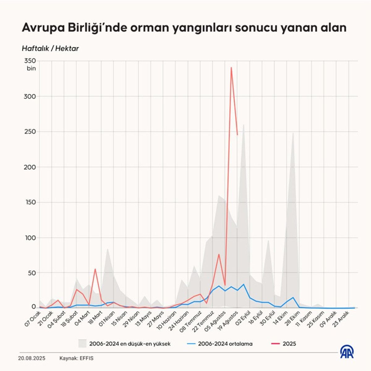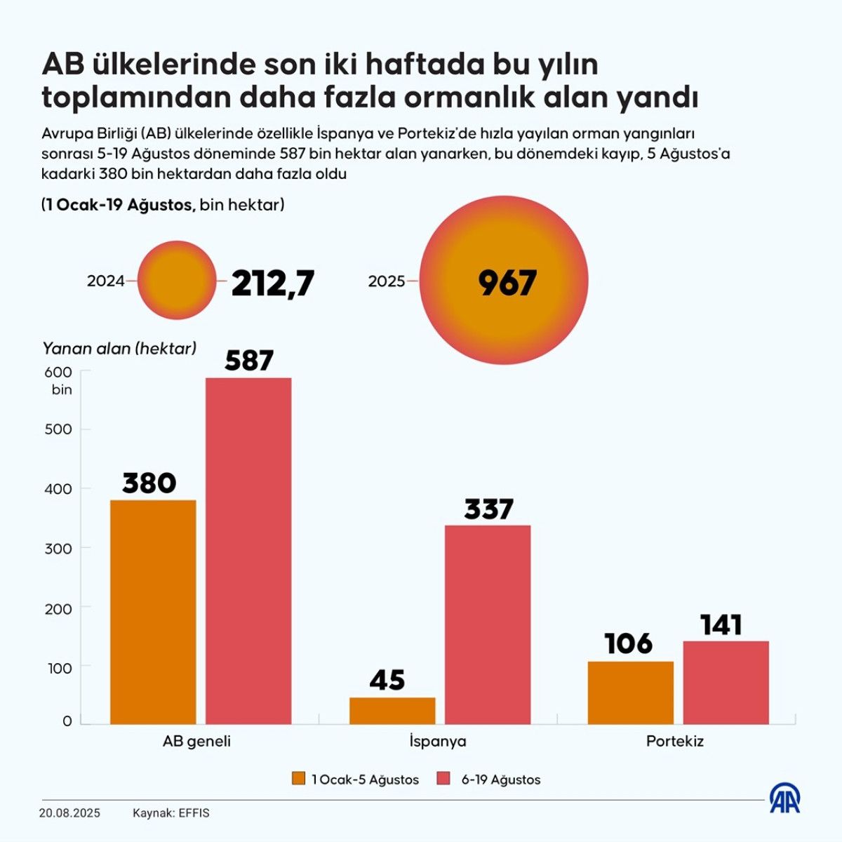 Avrupa Orman Yangınları Bilgi Sistemi bilgilerinden derlediği son bilgilere nazaran, AB ülkelerinde yılın başından bu yana çıkan orman yangınlarında 19 Ağustos prestijiyle 967 bin hektar alan yandı.