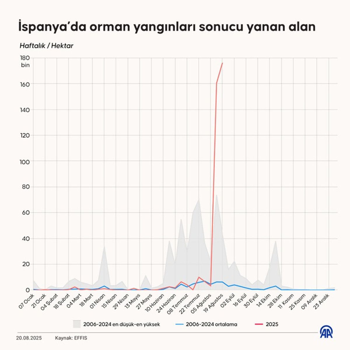 İtalya’da ise orman yangınlarında 5 Ağustos prestijiyle 58 bin 135 hektar olan kayıp, 19 Ağustos’ta 70 bin 315’e yükseldi. Böylelikle iki haftada 12 bin 183 hektar alan yangınlardan etkilendi. Fransa’da 19 Ağustos prestijiyle yanan toplam alan 35 bin 606 olurken, bu kaybın büyük kısmı ağustosun birinci günlerinde yaşandı.