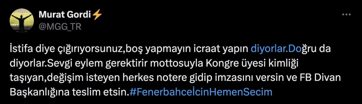 “İstifa diye çağırdığınızda ‘boş yapmayın icraat yapın diyorlar.’ Hakikat da diyorlar. ‘Sevgi hareket gerektirir’ mottosuyla Kongre üyelik kimliği taşıyan, değişim isteyen herkes notere gidip imzasını versin ve Fenerbahçe Divan Başkanlığı’na teslim etsin…”