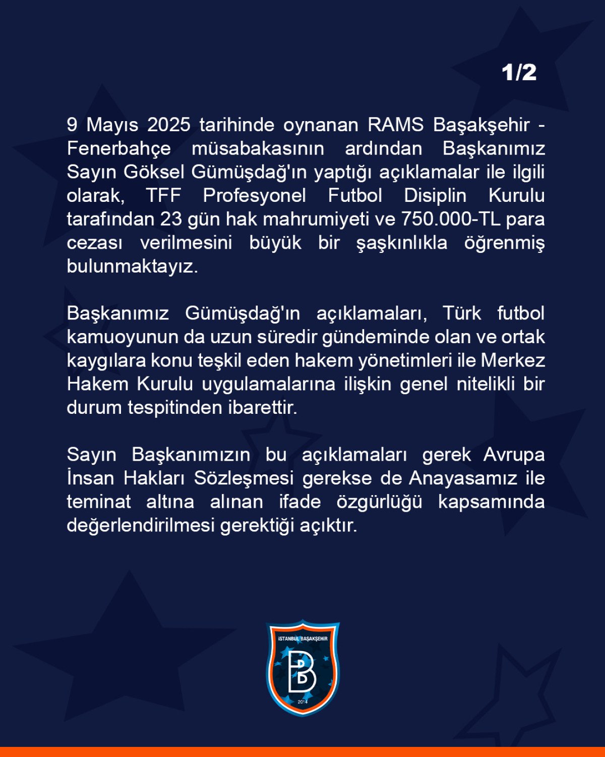 9 Mayıs 2025 tarihinde oynanan RAMS Başakşehir – Fenerbahçe karşılaşmasının akabinde Liderimiz Sayın Göksel Gümüşdağ’ın yaptığı açıklamalar ile ilgili olarak, TFF Profesyonel Futbol Disiplin Kurulu tarafından 23 gün hak mahrumiyeti ve 750.000-TL para cezası vermesini büyük bir şaşkınlıkla öğrenmiş bulunmaktayız.