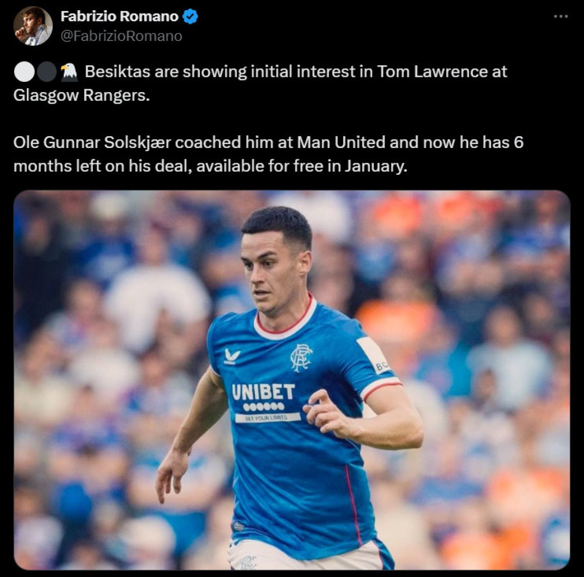Fabrizio Romano’nun haberine nazaran; Beşiktaş, Glasgow Rangers forması giyen on numara oyuncusu Tom Lawrence ile ilgileniyor.