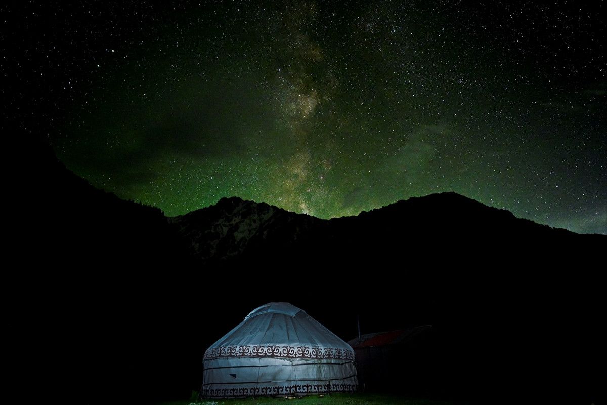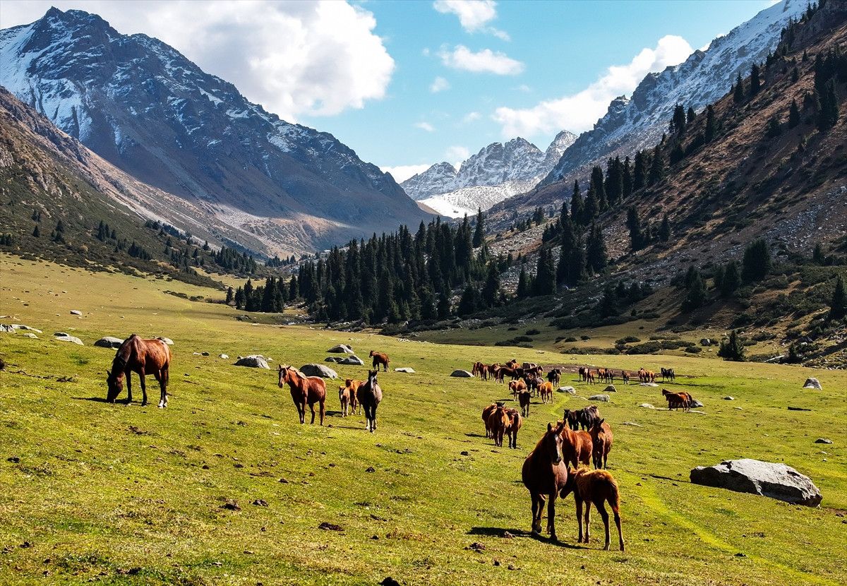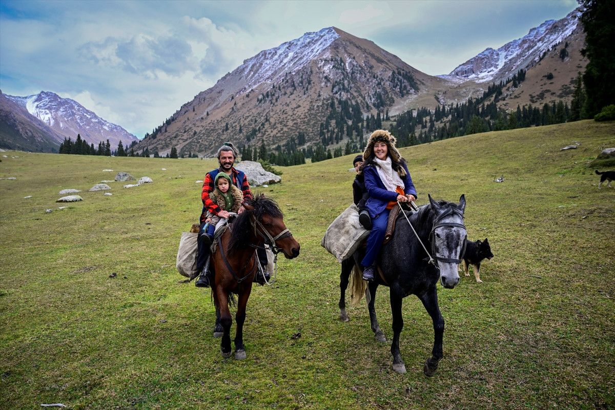 Yolculuk, yalnızca geçmişe değil, yüksek doruklara de uzandı. İlah Dağları’nın eteklerinde, 4 bin metre rakıma kadar atlarla tırmanan çift, burada klâsik bir “boz üy” (keçe çadır) kurup yöresel yemekler pişirdi.