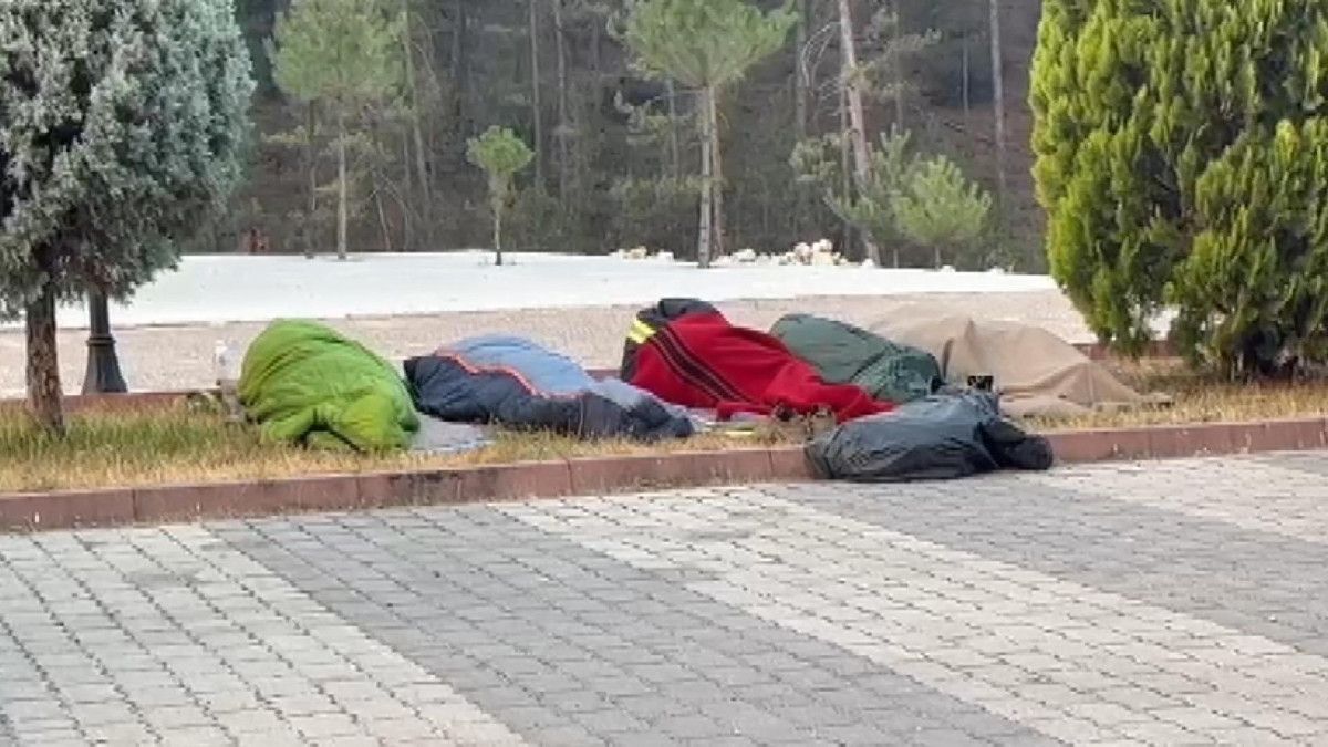 Bölgede yangın, gün ağarınca görüntülenirken, etraf vilayetlerden dayanağa gelen gruplar, uyku tulumlarıyla birlikte kaldırımda uyudu.