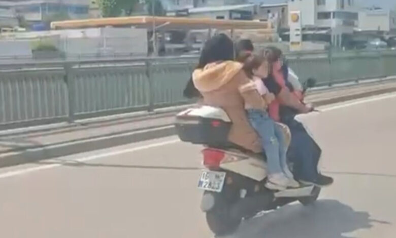 Görüntülerde, şoförün ardında iki yetişkin ve motosikletin ön kısmında biri bebek olmak üzere iki çocuk yer aldı.