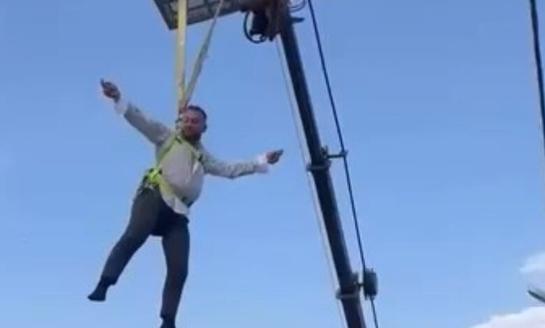 Damadın arkadaşları kiraladıkları vinç ile damadı iple sallandırdı.