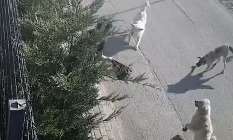 Bursa’nın Nilüfer ilçesinde, güvenlik vazifelisi olarak çalışan 25 yaşındaki Esra Kuloğlu, her zamanki güzergahından işine giderken bir anda sokak köpeklerinin maksadı oldu.