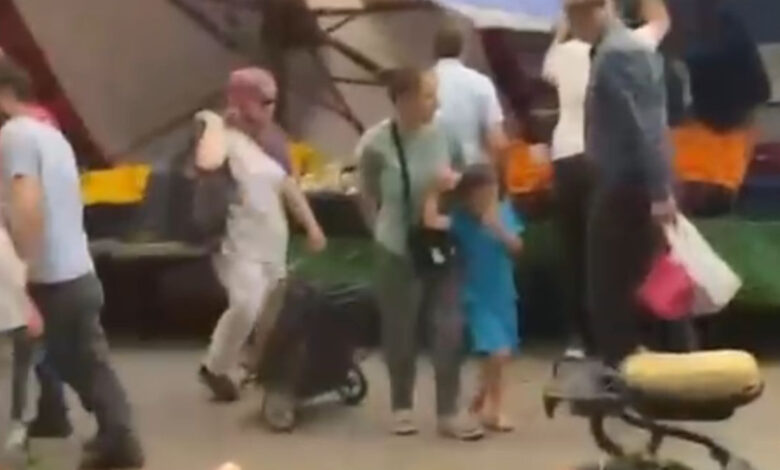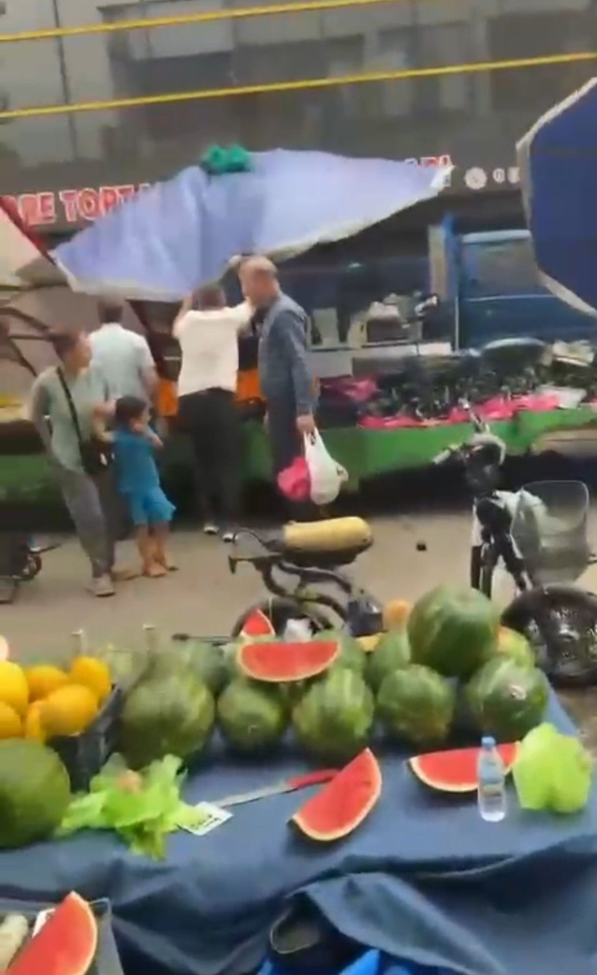Pazarcıların devrilen çadırları uçmaması için tuttuğu anlar cep telefonu kamerasıyla kaydedildi.
