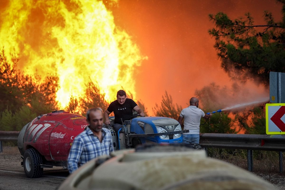 Yangını denetim altına almak için takımların havadan ve karadan müdahalesi sürerken vatandaşlar da takımlara dayanak vererek yangına müdahale ediyor.