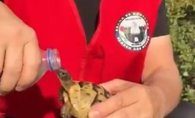 Bursa’da yangından kurtardıkları kaplumbağaya su verdiler