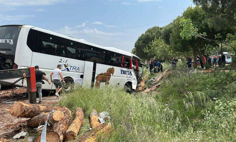 Bu sırada Ezine istikametine giden 34 DCJ 400 plakalı araba ile İstanbul-İzmir seferini yapan içerisinde 22 yolcu ve 3 işçi bulunan Truva Turizm’e ilişkin 17 AHT 624 plakalı yolcu otobüsü, tomruklara çarpıp, savrularak şarampole girdi.