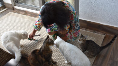 Trabzon’da yaşayan 43 yaşındaki Pınar Özkan, biri görme engelli olan beş kediye meskeninde yuva oluyor.