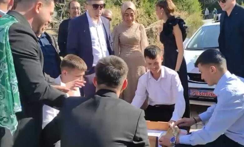 Çorum’un İskilip ilçesine bağlı Yanoğlan köyünde yapılan düğünle Sude Arslan ile dünyaevine giren Bekircan Erden’in arkadaşları gelin arabasının yolunu okey masasıyla kesti, “Bahşiş yoksa yol açılmaz” diye slogan tuttu.