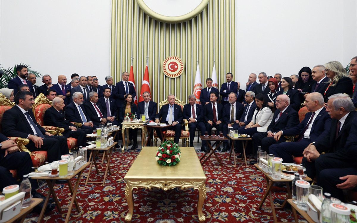 Erdoğan; MHP Genel Lideri Devlet Bahçeli, DEM Parti Eş Genel Liderleri Tuncer Bakırhan ve Tülay Hatimoğulları Oruç, DEVA Partisi Genel Lideri Ali Babacan, Gelecek Partisi Genel Lideri Ahmet Davutoğlu, Büyük Birlik Partisi Genel Lideri Mustafa Destici, HÜDA PAR Genel Başkanı Zekeriya Yapıcıoğlu ve milletvekilleri ile sohbet etti.