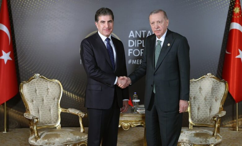 Cumhurbaşkanı Recep Tayyip Erdoğan, Antalya Diplomasi Forumu vesilesiyle Türkiye’de bulunan Irak Kürt Bölgesel Yönetimi (IKBY) Başkanı Neçirvan Barzani’yi kabul etti. Gerçekleşen görüşmede, Türkiye-Irak ilgileri başta olmak üzere, IKBY ile iş birliği imkanları, bölgesel gelişmeler ve global sorunlar kapsamlı formda ele alındı.