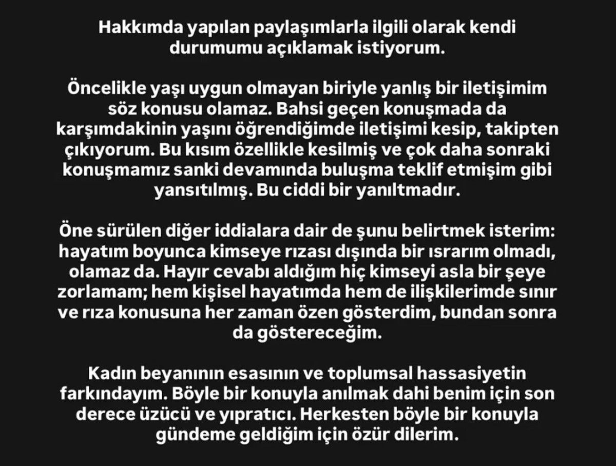 Hakkımda yapılan paylaşımlarla ilgili olarak kendi durumumu açıklamak istiyorum. Öncelikle yaşı uygun olmayan biriyle bir bağlantım kelam konusu olamaz. Bahsi geçen konuşmada da karşımdakinin yaşını öğrendiğimde irtibatı kesip, takipten çıkıyorum. Bu kişi bilhassa kesilmiş ve çok daha sonraki konuşmamız güya devamlıymış üzere eksik iletilmişim üzere yansıtılmış. Bu önemli bir yanıltmadır.
