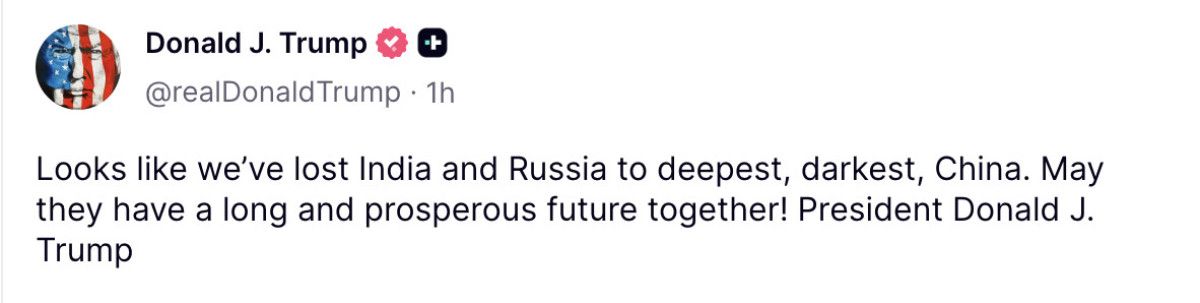 Paylaşımda, Trump, son devirde Hindistan, Rusya ve Çin ortasındaki güçlenen işbirliğine yönelik, “Görünüşe bakılırsa Hindistan ve Rusya’yı en karanlık ve derin Çin’e kaptırdık.