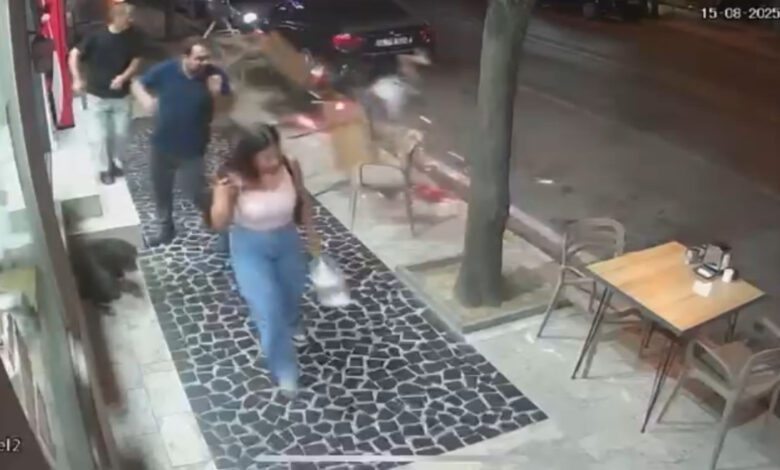 Motosikletlinin çarpışmasının akabinde işletmenin masa ve sandalyesine çarparak savrulduğu ve bu esnada kaldırımda bulunan 3 kişinin ise saniyelerle kazadan kurtulduğu görülüyor.