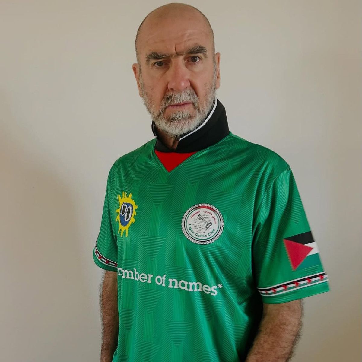 Cantona, toplumsal medya hesabından yaptığı paylaşımda Beytüllahim’deki Aida mülteci kampının ekibi Lajee Celtic Club’ın formasını giyerek dayanak iletisi verdi.