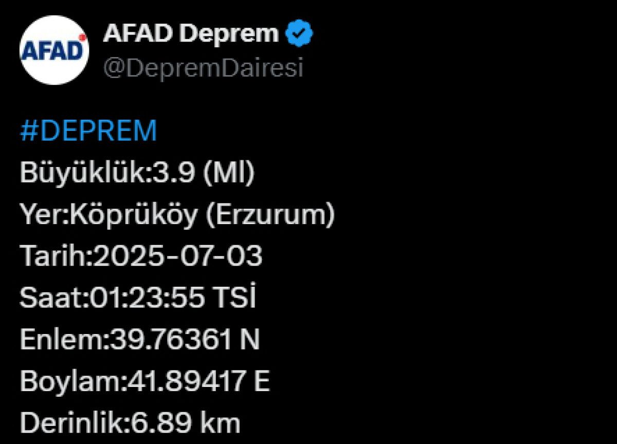 Afet ve Acil Durum İdaresi Başkanlığı’nın internet sitesinde yer alan bilgiye nazaran saat 01.23’te merkez üssü Köprüköy ilçesi olan 3.9 büyüklüğünde sarsıntı kaydedildi.
