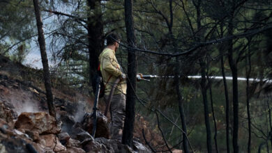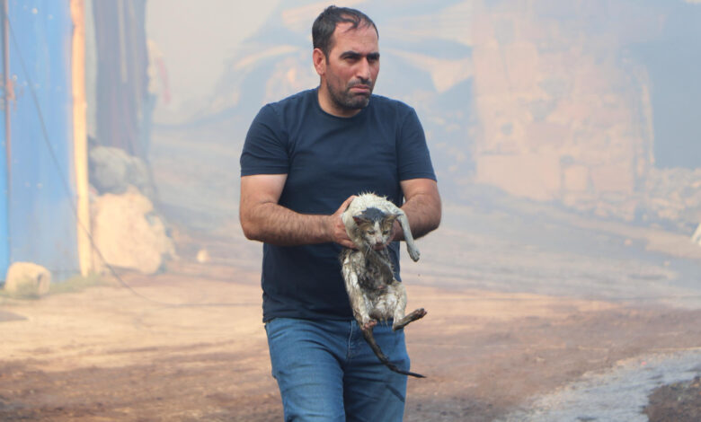 Yangın sırasında komşu mahalle olan Yeşilyayla’dan yardıma gelen Muharrem Karahan, alevlerin sardığı bir meskende mahsur kalan kediyi fark etti.