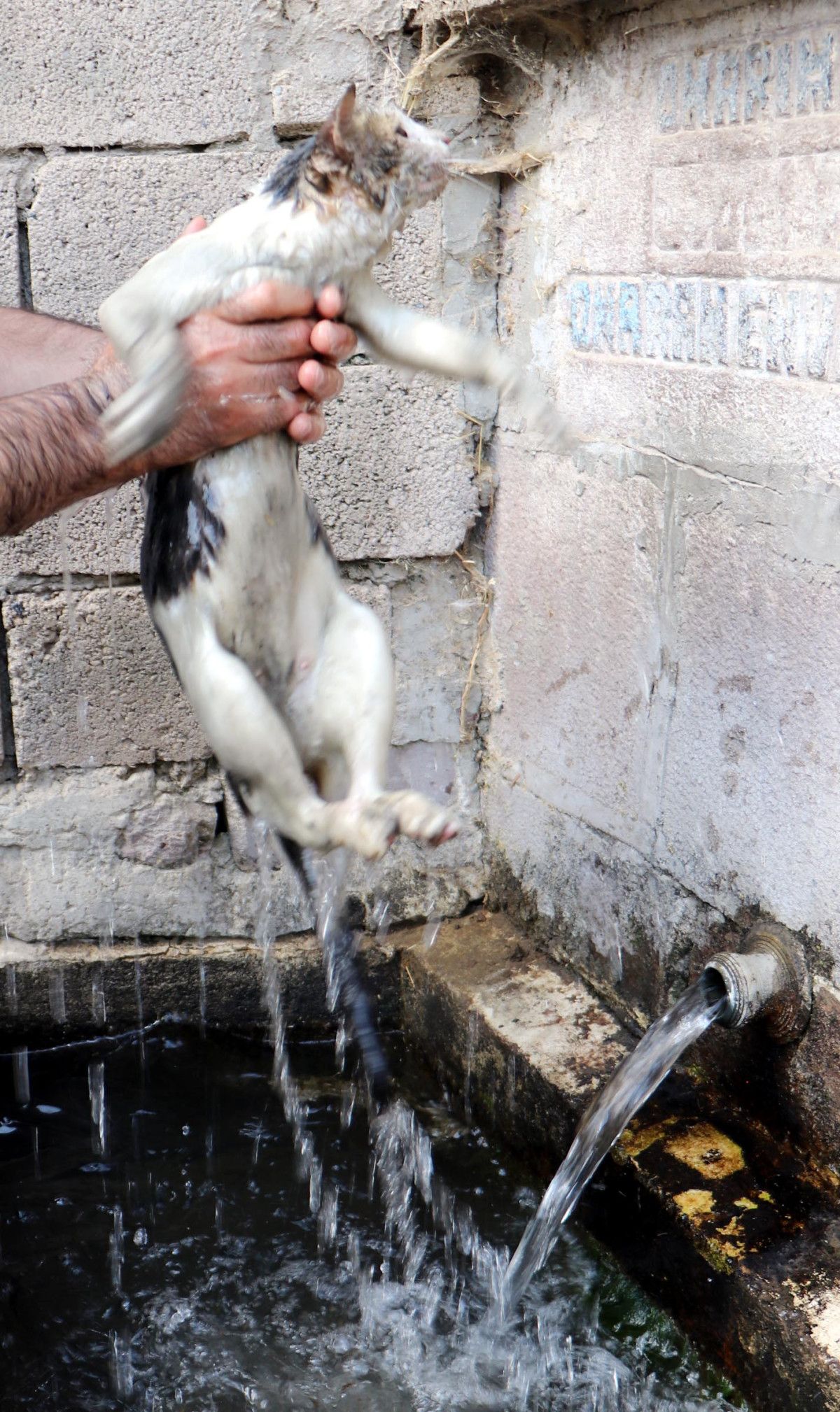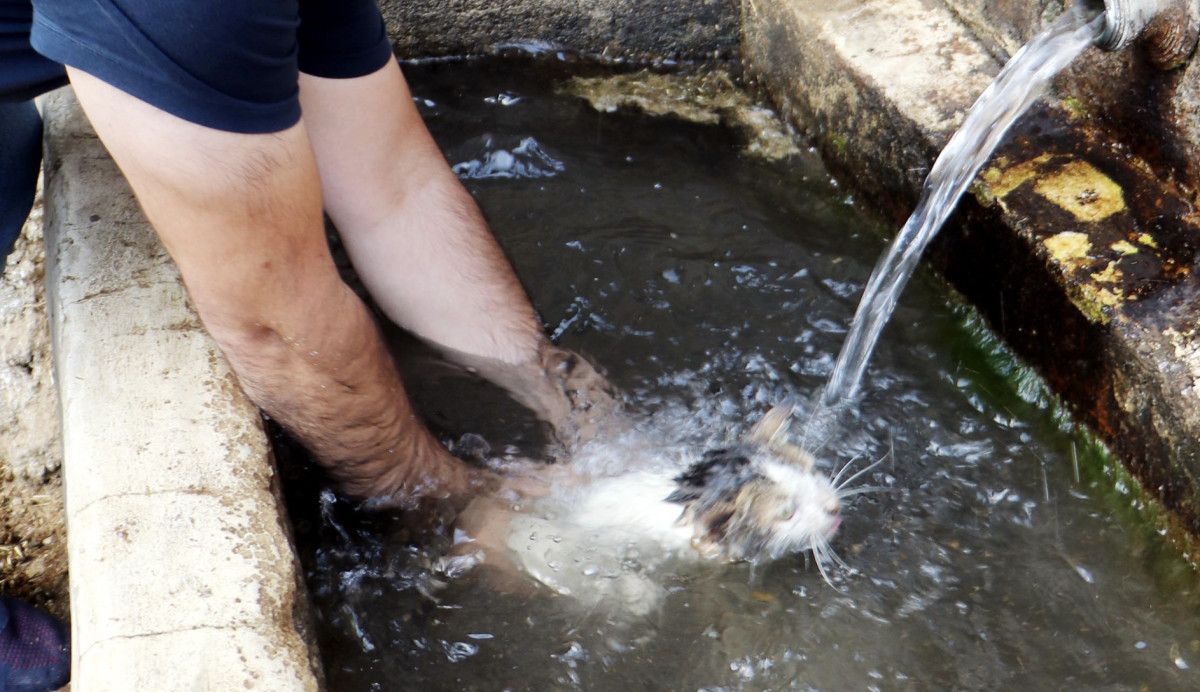 Alevlerin içine girerek kediyi dışarı çıkaran Karahan, çeşme suyuyla yıkayarak onu hayata döndürdü.