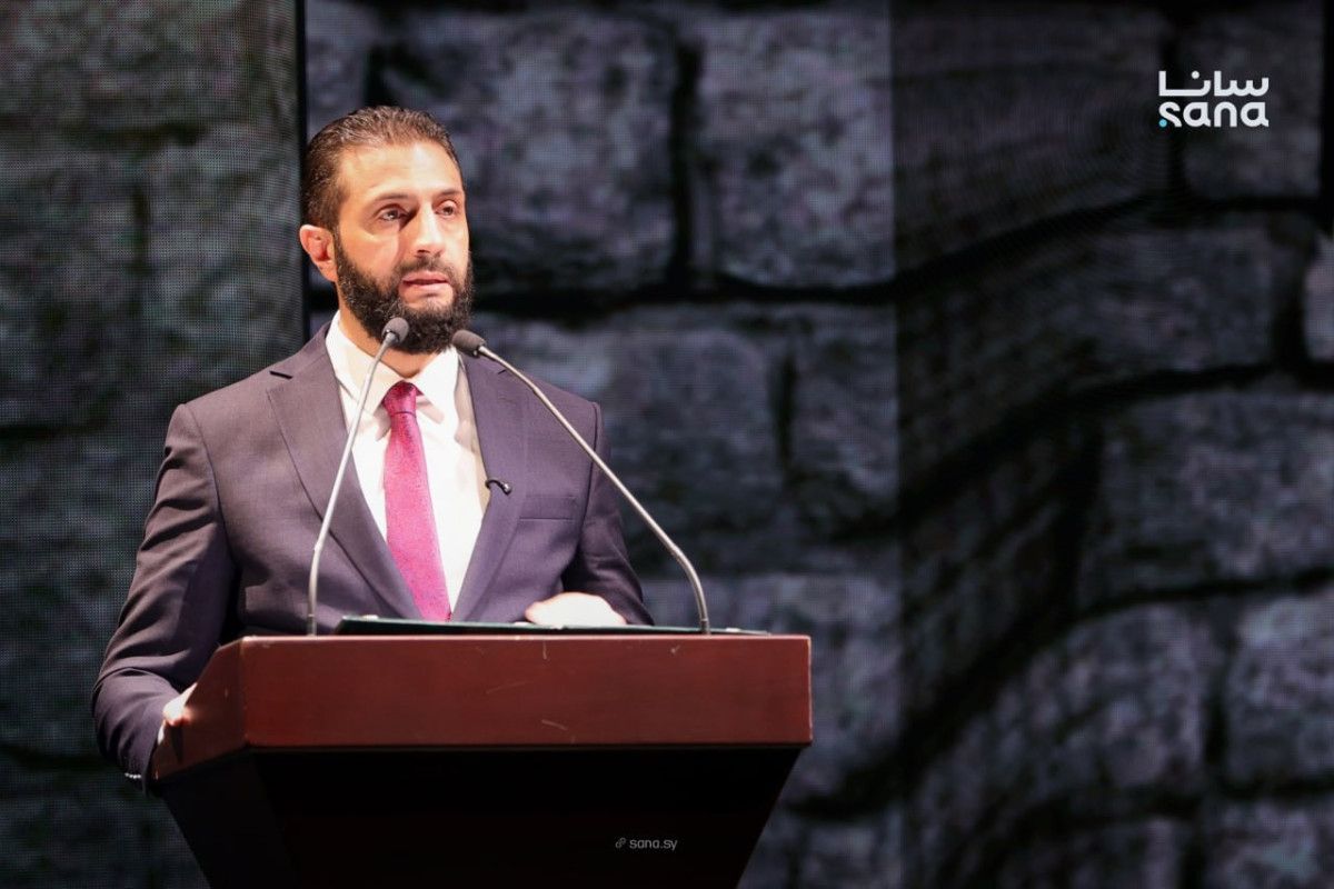 Şara, konuşmasında “Devrik rejim iktisadımızı yıktı, servetlerimizi talan etti, meskenlerimizi harap etti ve halkımızı kamplara, gurbet ellerine savurdu. Bugün burada, yaralı Suriye’mizi onarmak, ülkemizi tekrar inşa etmek ve yerinden edilen vatandaşlarımızı topraklarına döndürmek için bir ortaya geldi” sözlerini kullandı.