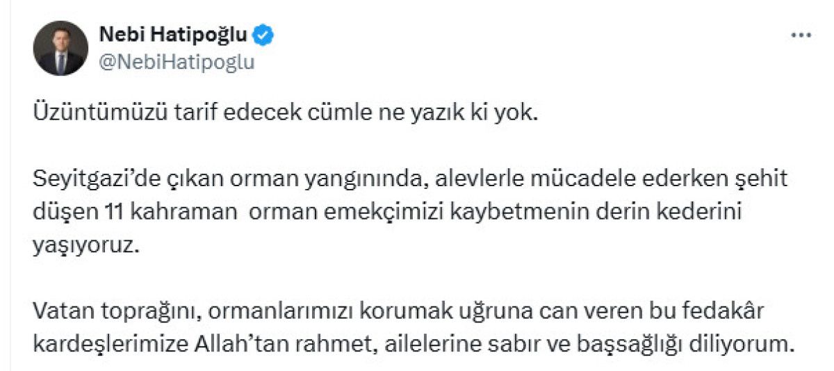 Vatan toprağını, ormanlarımızı korumak uğruna can veren bu fedakâr kardeşlerimize Allah’tan rahmet, ailelerine sabır ve başsağlığı diliyorum.