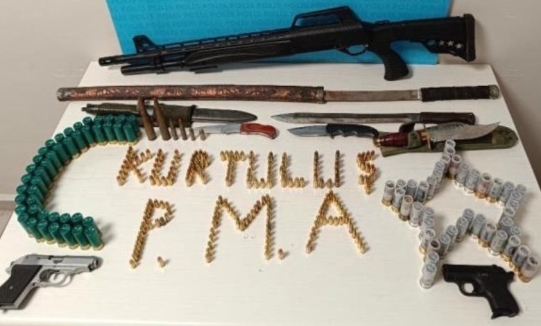 Şahsa ilişkin iş yerinde yapılan aramada 2 adet ruhsatsız tabanca, 1 adet ruhsatsız av tüfeği, 296 adet fişek, 2 adet boş kovan, 2 adet mermi çekirdeği, 5 adet bıçak ve 1 adet kılıç ele geçirildi.