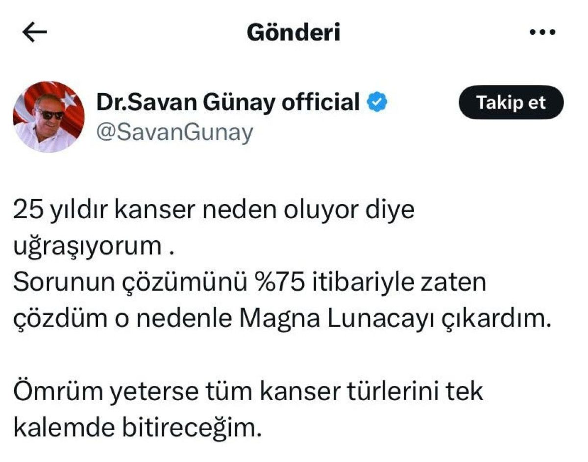 Emekli doktor Mustafa Sanan Günay’ın mayıs ayında toplumsal medyada 25 yıldır kanserin nedenlerini araştırdığını belirterek, “25 yıldır kanser neden oluyor diye uğraşıyorum. Sorunun tahlilini yüzde 75 itibariyle zati çözdüm o nedenle Magna Lunaca’yı (takviye gıda) çıkardım. Ömrüm yeterse tüm kanser tiplerini tek kalemde bitireceğim” diye yazmıştı.