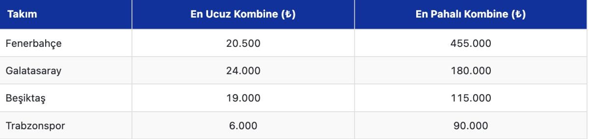 Trendyol Süper Lig’de 2025-2026 döneminde dört büyüklerin dönemlik (öğrenci, engelli ya da 65 yaş üstü dışında) en ucuz ve en pahalı kombine bilet fiyatları (TL) şu biçimde: