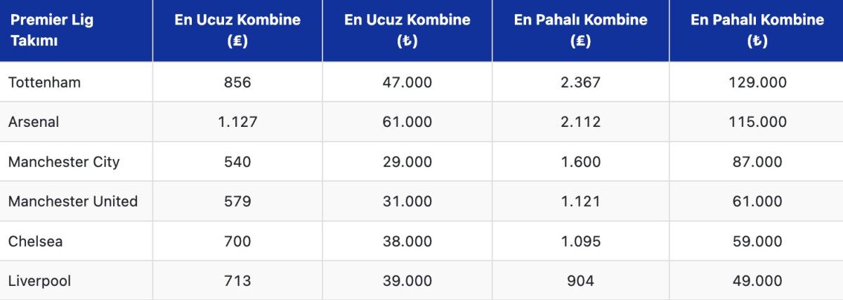 İngiltere Premier Lig’in “Büyük Altılı” olarak isimlendirilen dev kulüplerinin indirimli dönemlik biletleri (öğrenci, engelli ve 63 yaş üstü gibi) dışında en ucuz ve en pahalı kombine bilet fiyatları:
