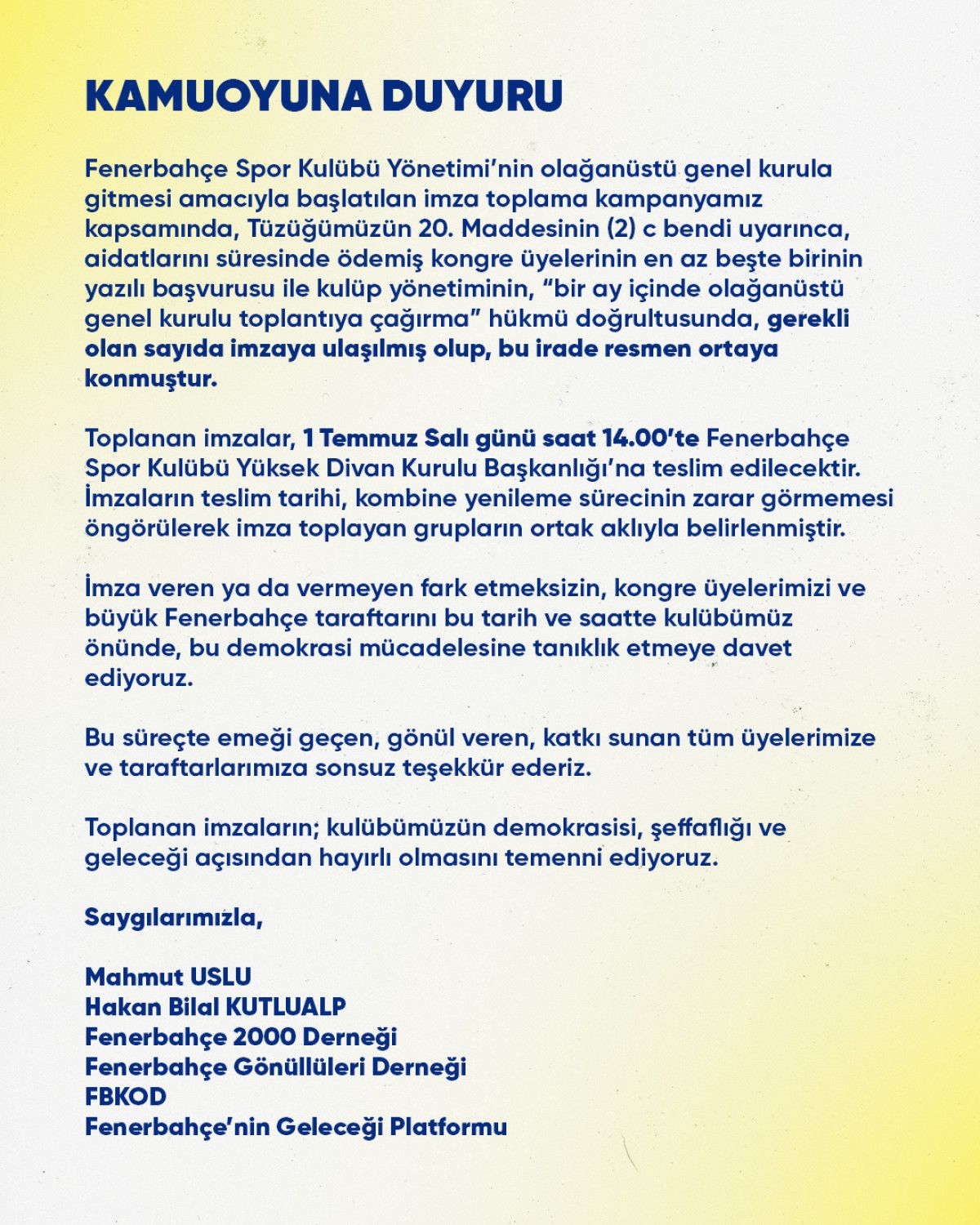 Toplanan imzalar, 1 Temmuz Salı günü saat 14.00’te Fenerbahçe Spor Kulübü Yüksek Divan Konseyi Başkanlığı’na teslim edilecektir. İmzalatın teslim tarihi, kombine yenileme sürecinin ziyan görmemesi öngörülerek imza toplayan kümelerin ortak aklıyla belirlenmiştir.