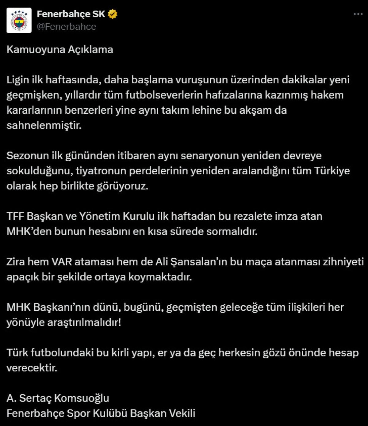 Bu karşılaşmanın akabinde ise Fenerbahçe Kulübü’nün resmi hesabından bir açıklama yapıldı.