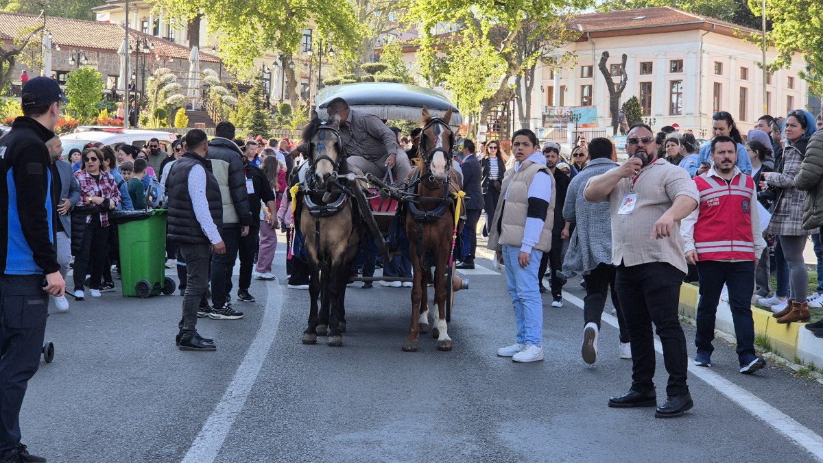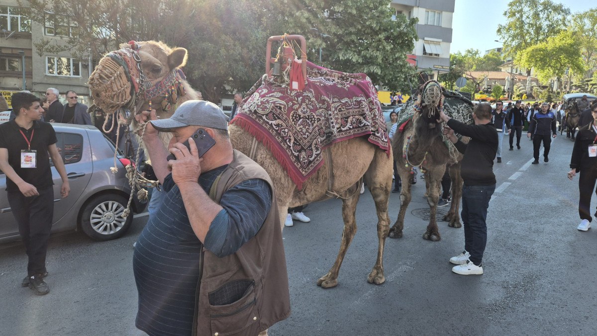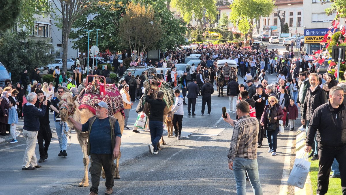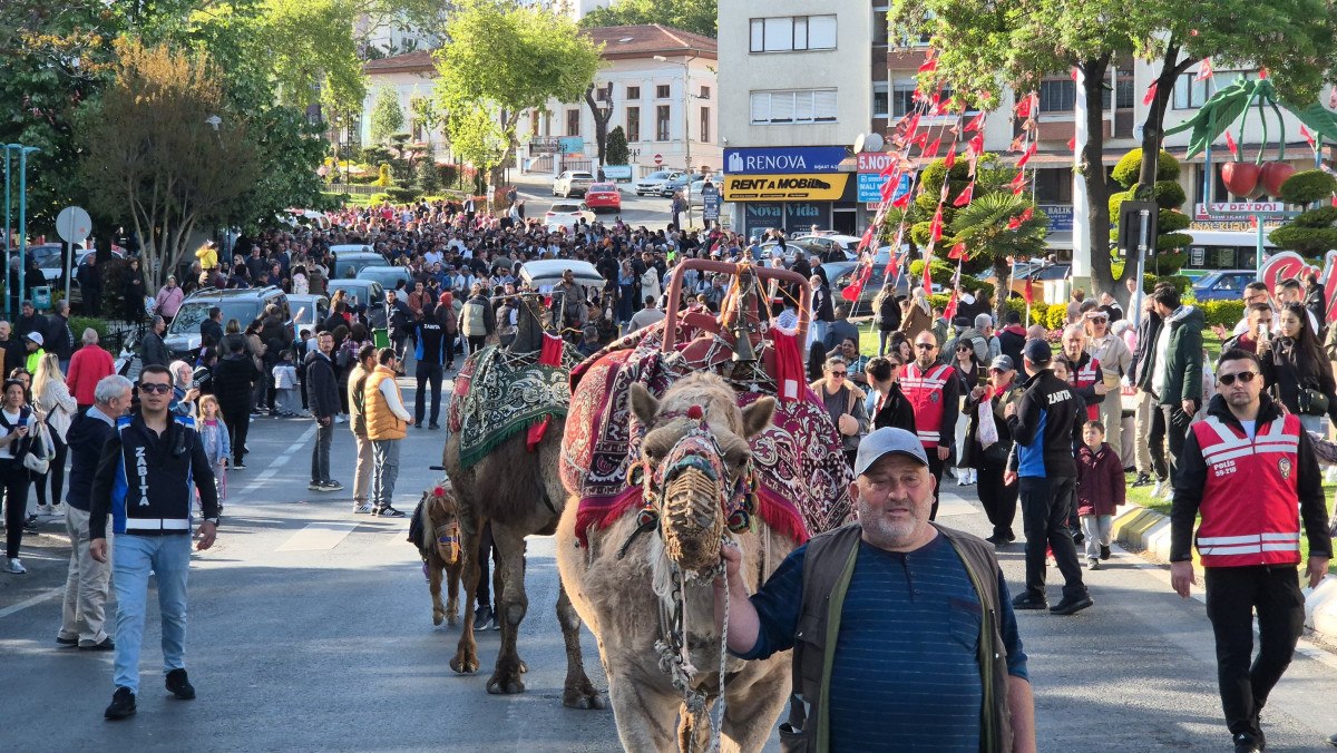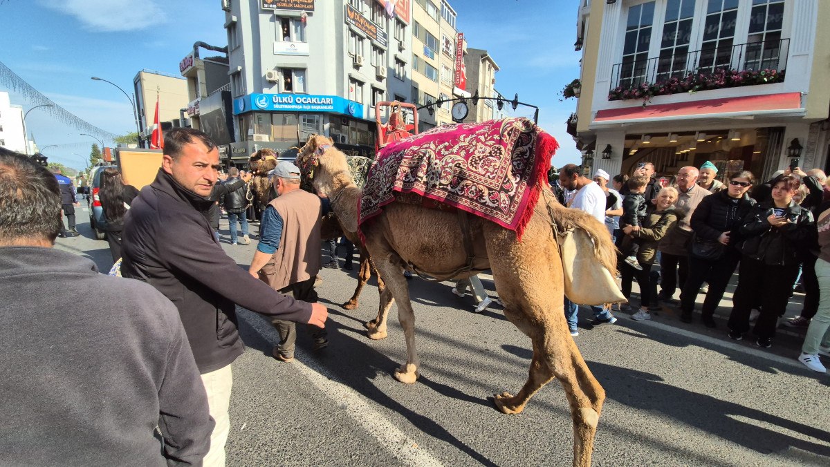 Kortejde yer alan süslenmiş fayton ve deve, çocuklar başta olmak üzere iştirakçilerin büyük ilgisini çekti.